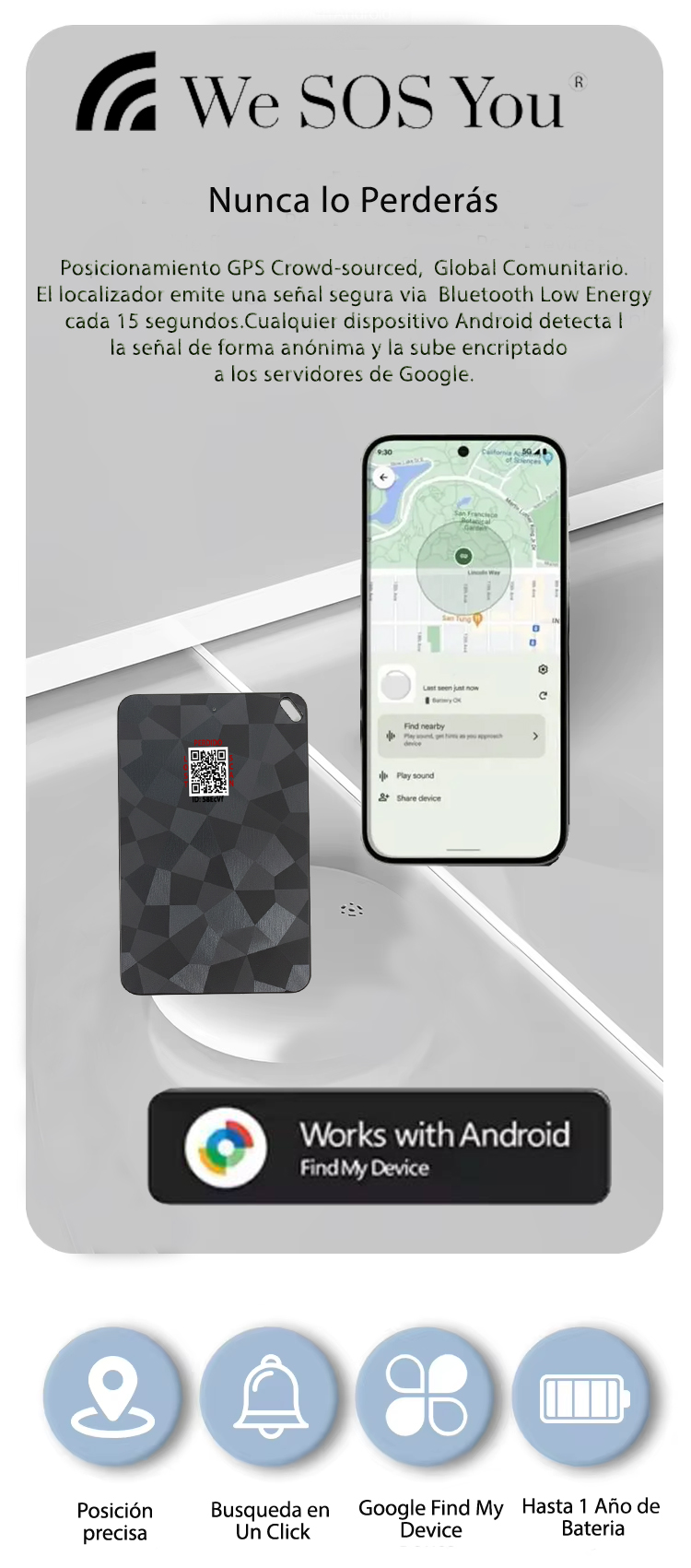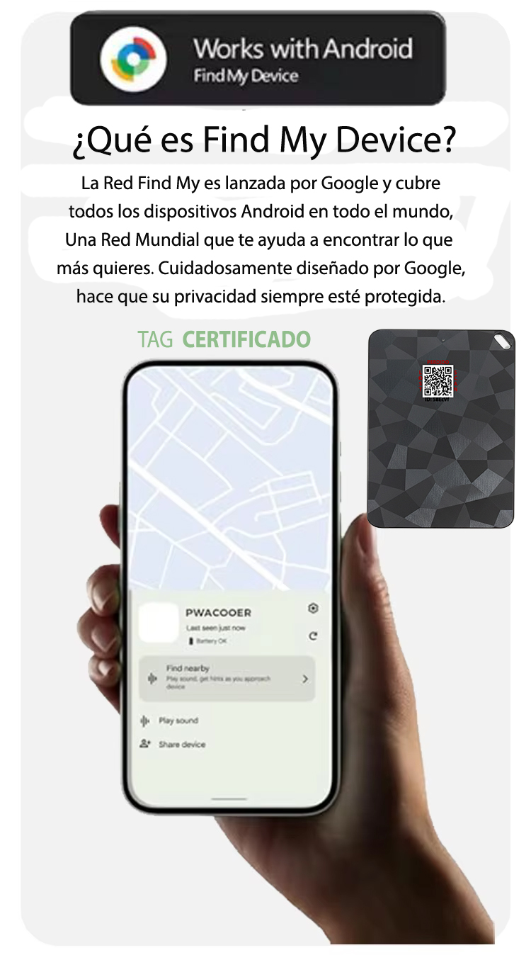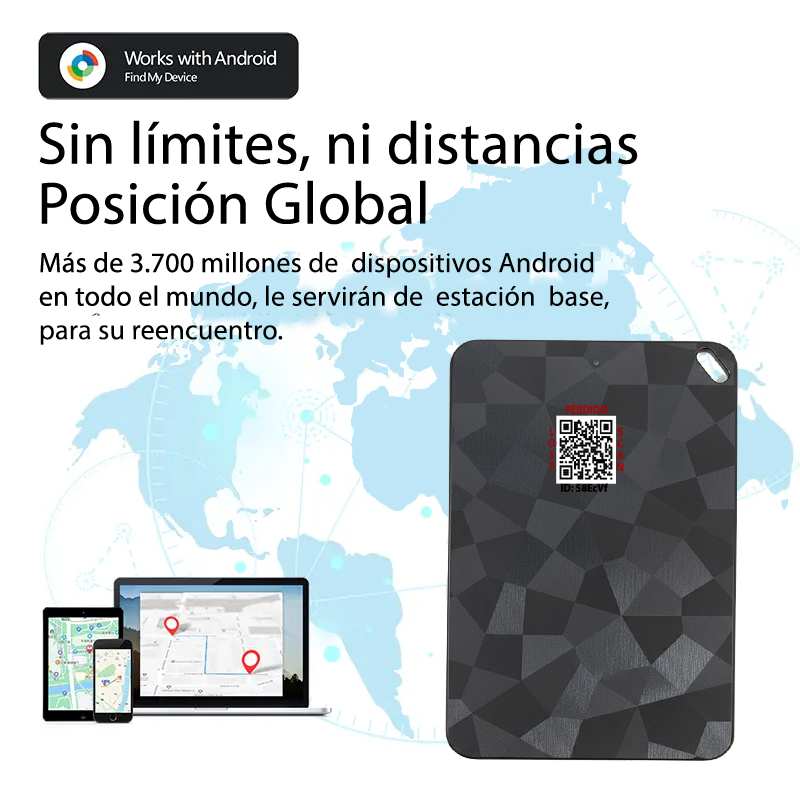 Localización GPS Crowd-sourced: Posicionamiento Global Comunitario. El localizador emite una señal segura mediante Bluetooth Low Energy cada 15 segundos.Cualquier dispositivo de los millones de Android/Apple cercanos (con conexión a internet y servicios de Google/Apple activos) detecta esta señal de forma anónima y la sube de manera encriptada a los servidores de Google/Apple.El usuario puede visualizar en tiempo casi real la última ubicación registrada de su localizador a través de la aplicación oficial Google Find My Device/Apple Find My, con total privacidad y seguridad.